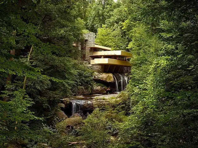 Detta hus är byggt direkt över ett vattenfall och designat av den berömda arkitekten Frank Lloyd Wright. Fallingwater är en unik kombination av modern design och naturens skönhet vilket gör det till ett perfekt resmål för natur- och arkitekturentusiatser.