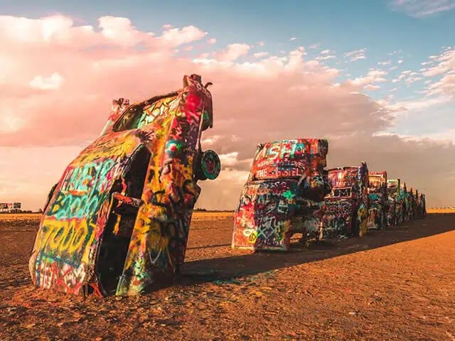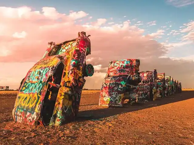 Detta unika konstverk är en installation av halvbegravda och graffitimålade Cadillac-bilar. Cadillac ranch är en välkänd plats där besökare uppmuntras att själva måla på bilarna, vilket gör det till en interaktiv konstupplevelse för hela familjen.
