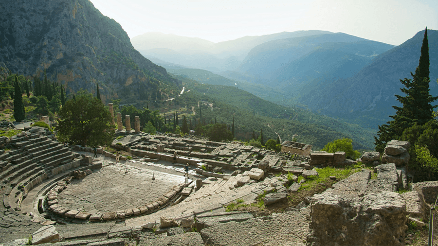 Delphi var under antiken en av de viktigaste religiösa platserna i hela den grekiska världen. Staden ligger på sluttningarna av berget Parnassos och erbjuder en spektakulär utsikt över dalen nedanför.