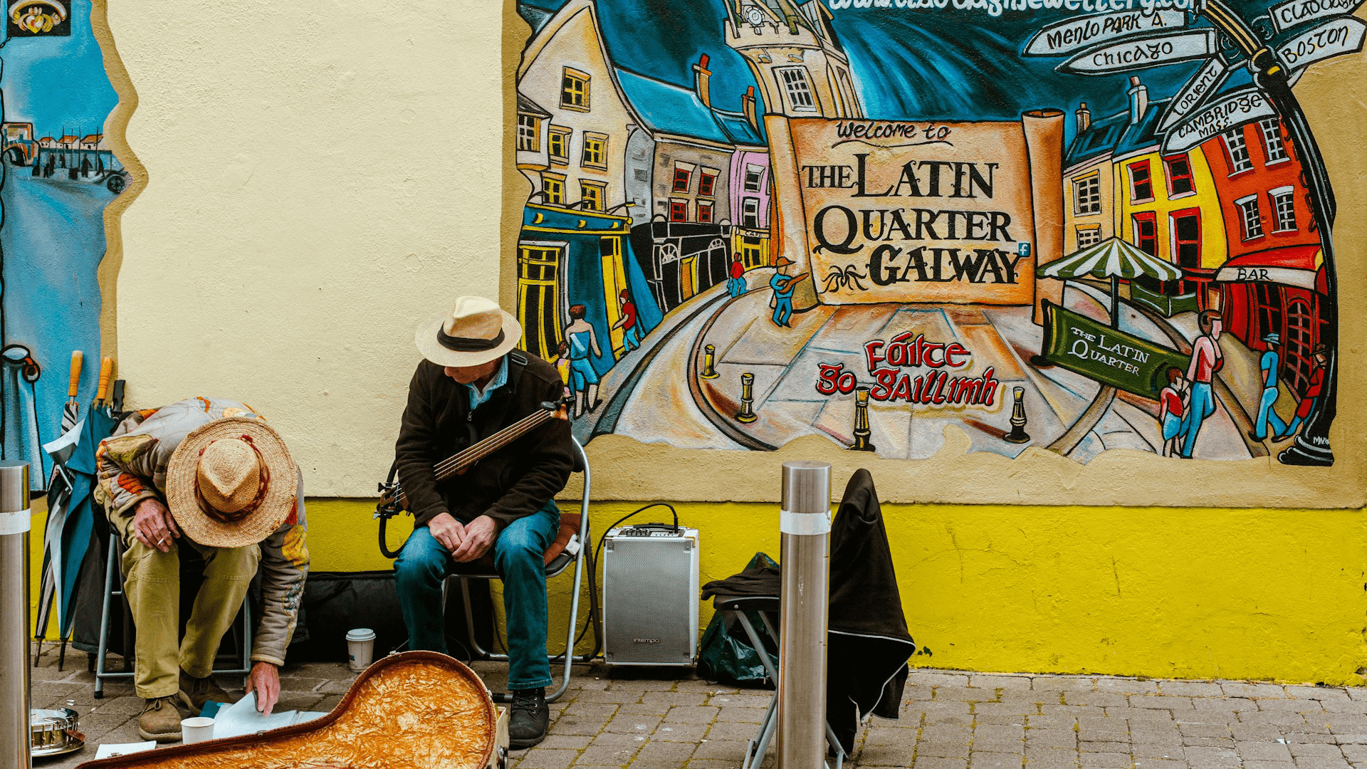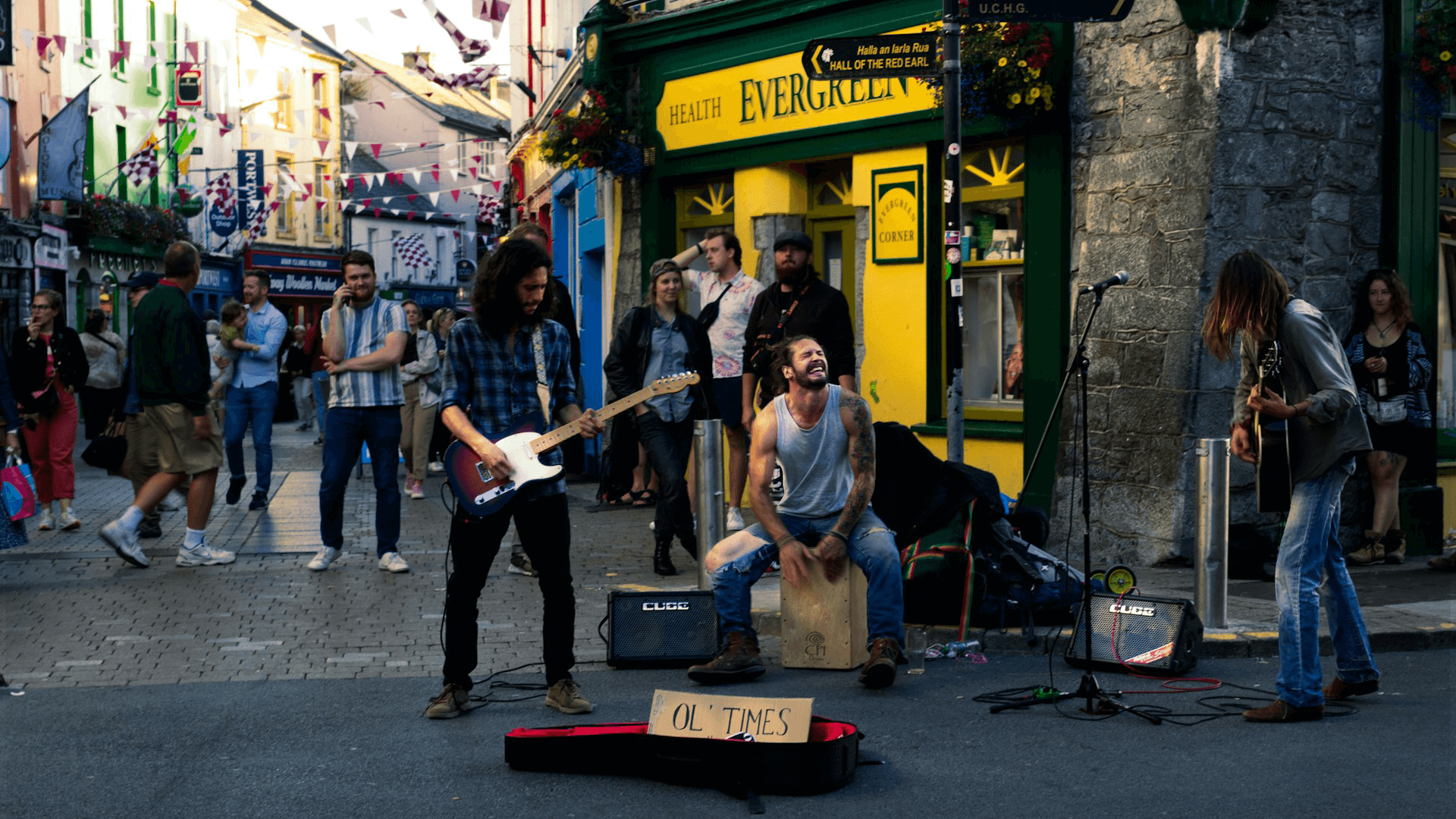 Galway är känt som Irlands mest musikaliska stad och erbjuder livemusik nästan dygnet runt. Traditionell irländsk musik spelas i pubar som The Crane Bar, Tig Cóilí och Tigh Neachtain, där både lokala och internationella musiker samlas spontant för att spela. Gatumusikanter fyller gatorna i Latin Quarter med allt från fioler och bodhrans till modern singer-songwriter-musik. Musiktraditionen är så stark att den blivit en central del av stadens identitet och en av anledningarna till att staden anses vara Irlands kulturella hjärta.