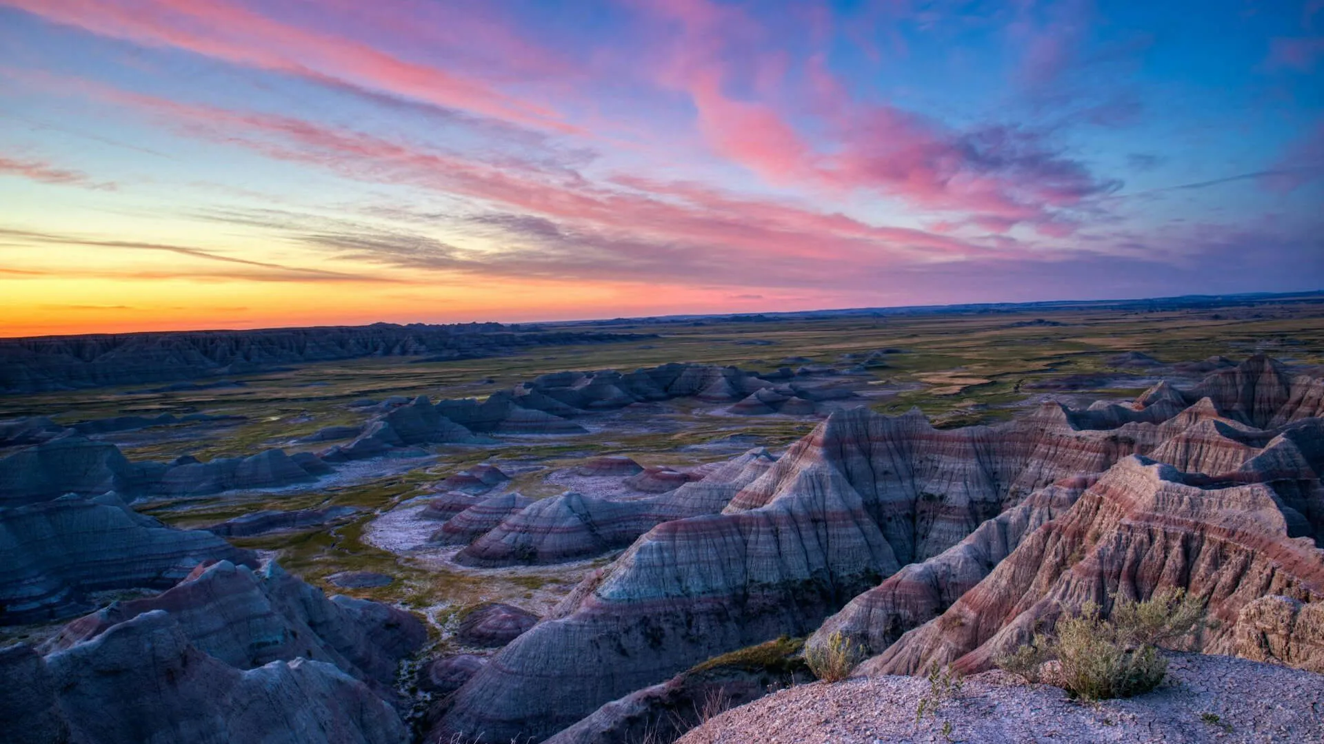 Badlands National Park är en annan naturlig juvel där erosionsformer, klippformationer och dalgångar bildar ett nästan utomjordiskt landskap. Här finns utsiktsplatser, vandringsleder och möjligheter att spana efter vilda djur i det öppna prärielandet. Parken skyddar också stora områden med orörd gräsmark.