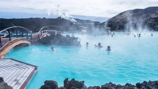 Du tas med hjälp av transfer från flygplatsen till den Blå Lagunen för en fantastisk upplevelse med bad i det varma och välgörande vattnet. Här ingår välkomstdrink och lån av handduk.