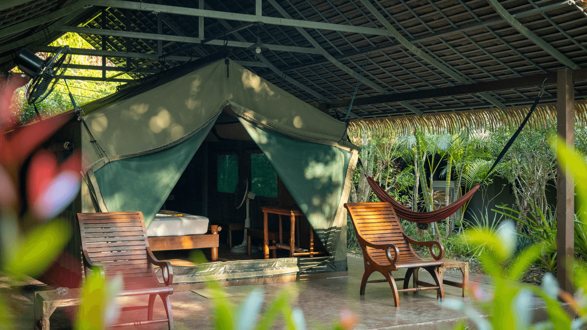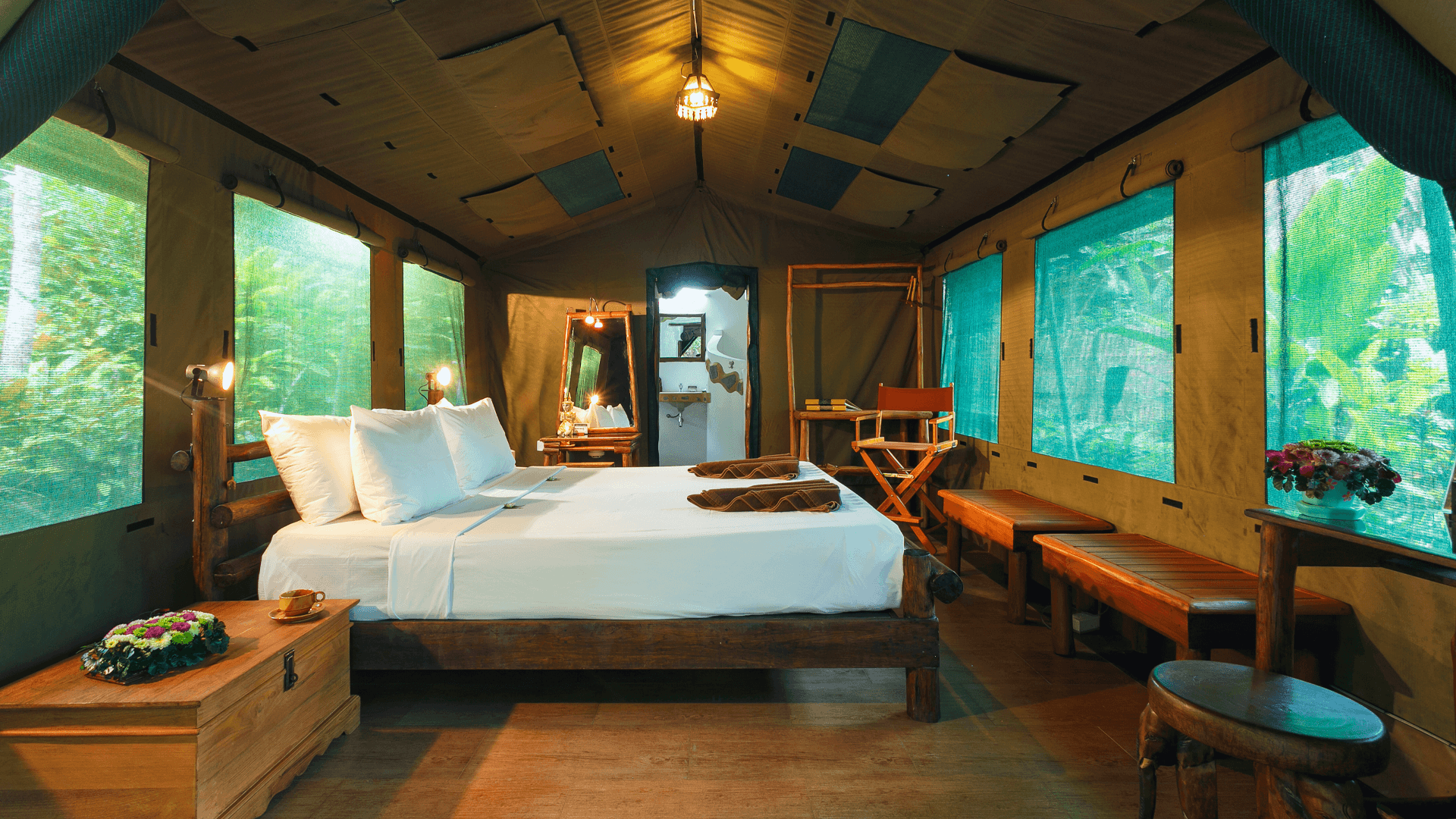 När du besöker Elephant Hills bor du i ett rymligt glampingtält som är designat för att ge maximal komfort mitt i naturen. Tälten är tillverkade av slitstark och vattentät canvas och är fullt utrustade med alla bekvämligheter som man förväntar sig av ett fyrastjärnigt hotellrum. Varje tält har riktiga sängar, fläktar, te- och kaffestation samt en egen veranda där gäster kan koppla av i en hängmatta och lyssna på djungelns ljud. Tälten har dessutom privata badrum med västerländska toaletter, varma duschar och hårtork. Elektricitet finns tillgänglig så att gäster kan ladda sina enheter, och WiFi erbjuds för den som behöver vara uppkopplad även mitt i djungeln.