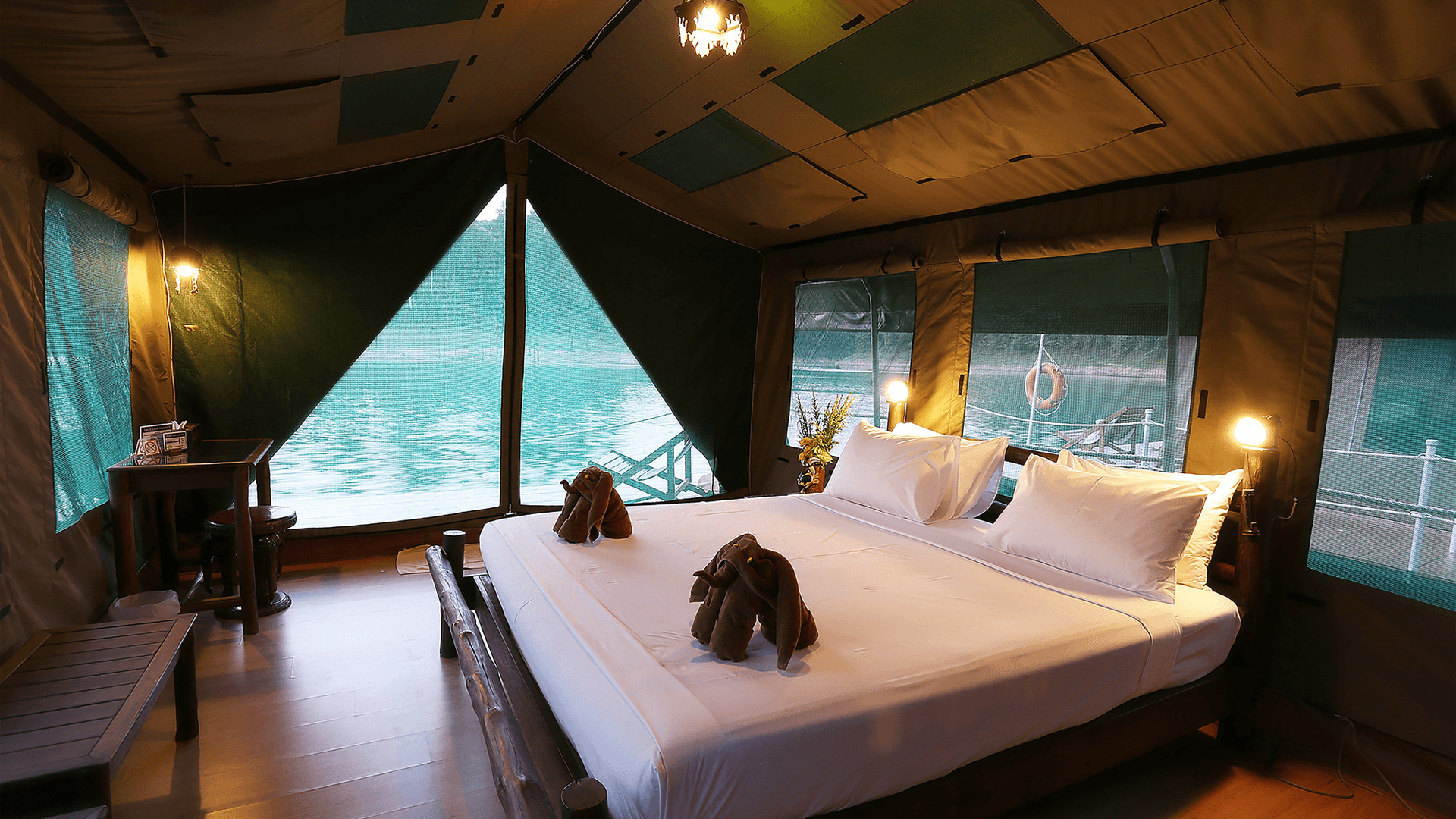 Det andra campet är Lake Camp som ligger mitt ute på Cheow Larn Lake, en enorm smaragdgrön sjö på cirka 165 kvadratkilometer i hjärtat av nationalparken. Detta flytande camp är en av världens få lyxiga flytande tältanläggningar och erbjuder en spektakulär miljö där gäster bokstavligen bor ovanpå vattnet. Lake Camp är uppbyggt på stora flytande pontoner och består av exklusiva tält som står på träplattformar direkt över sjön. Från tältens verandor kan gäster blicka ut över vattnet och de dramatiska kalkstensklipporna som reser sig ur landskapet. På morgonen vaknar man ofta till dimma som sakta lyfter över sjön medan djungelns ljud fyller luften. Att bo på Lake Camp ger en helt annan känsla än vistelsen i djungelcampet. Här är tempot lugnare och naturen står i absolut centrum. Många beskriver detta som resans höjdpunkt.